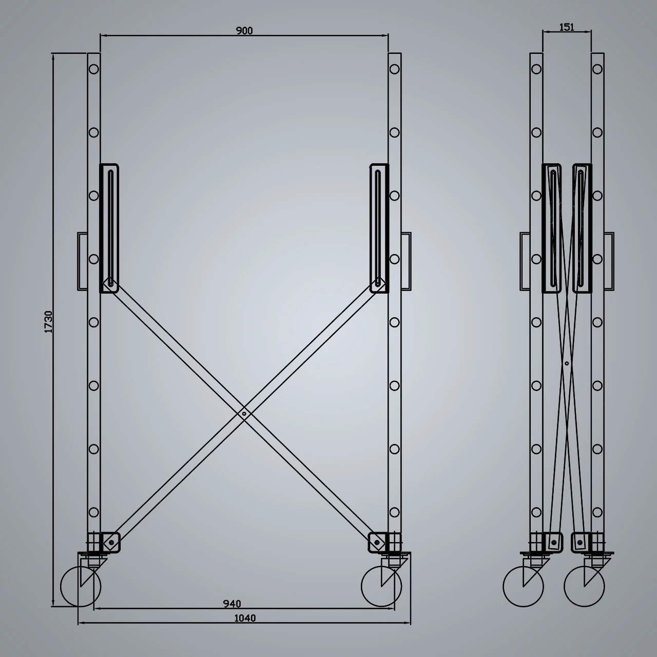 Istnieje możliwość regulacji przęseł. Wszystkie koła są skrętne a dwa posiadają hamulec. Konstrukcja bardzo stabilna i wytrzymała.